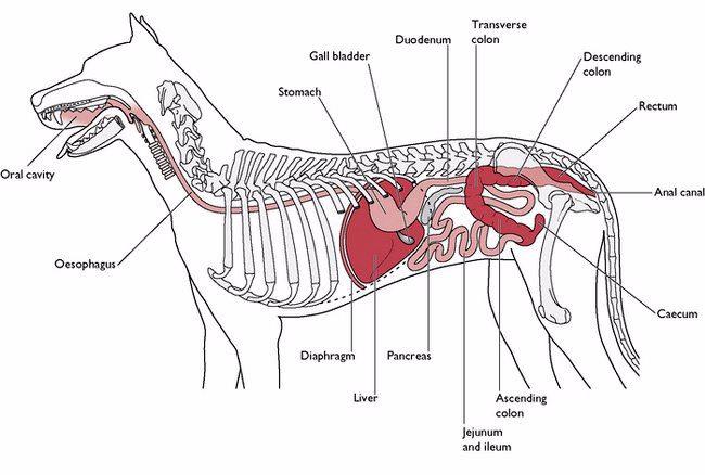 El alimento es ingerido por los perros y discurre por los diferentes órganos que forman el aparato digestivo: esófago, estómago, intestino delgado e intestino grueso.